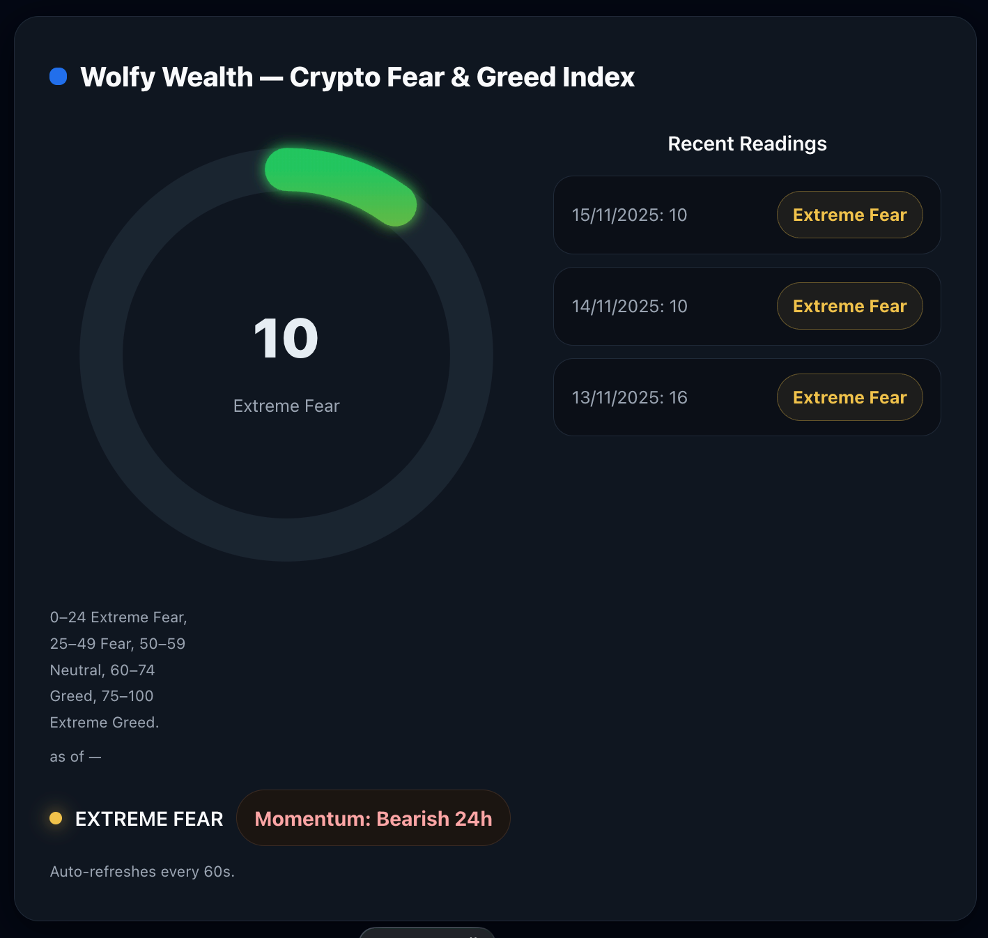 - Fear & Greed at 10 has historically marked high-quality entry zones